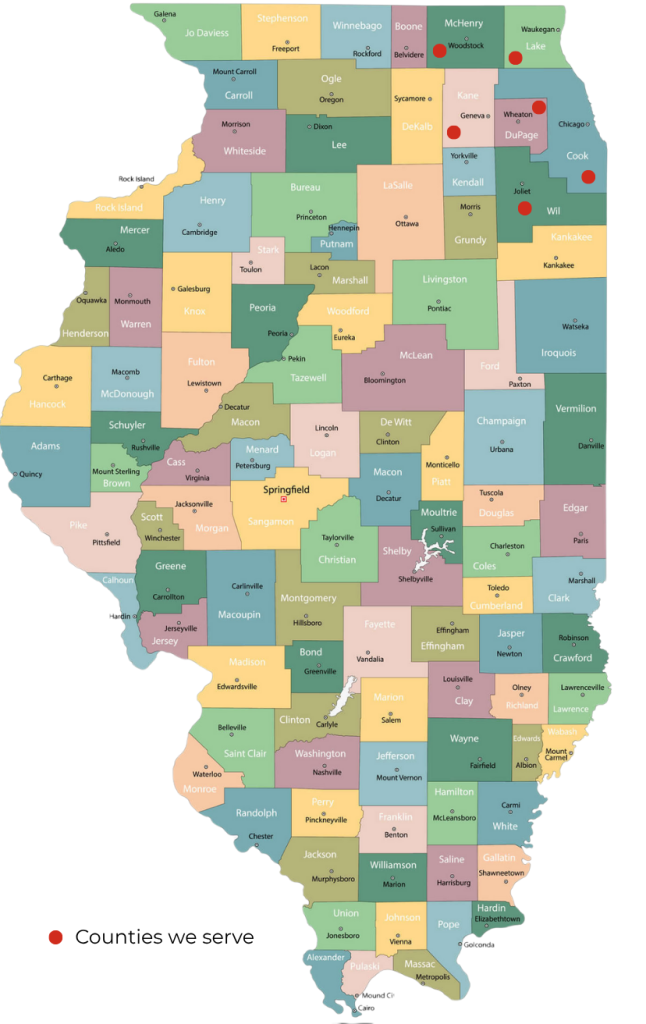 We proudly serve your neighborhood and currently provide care to clients in Cook, Will, DuPage, Lake, Kane, and McHenry counties. Our mission is to expand rapidly so that everyone in Illinois can access the care they need. For clients located outside of these counties, we also offer out-of-pocket or private pay options.